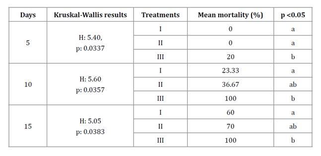 Mortality recorded at the end of the experiment (After 15 days) was 60%, 70%, and 100% for treatments I, II, and III, respectively. Mortality rates differed among treatments (One-Way ANOVA; F: 17.58; df:3, p: 0.0007), with control showing no mortality. Besides, significant differences in mortality percentages were observed at 5, 10, and 15 days (table 1).