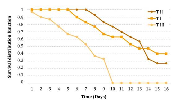 On day 15, mortality in treatment I was similar to that in treatment II (p > 0.05) but differed from treatment III, while treatment II and III were not significantly different from each other (p > 0.05). Kaplan-Meier survival curves (figure 1) further confirmed significant differences among treatments (log-rank test, p < 0.05) (table 2). Treatment III had the lowest survival rate (Log-rank test, p < 0.05).