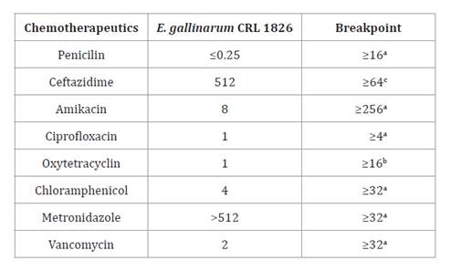 Based on breakpoint values, E. gallinarum CRL 1826 was sensitive to most antimicrobials except ceftazidime and metronidazole, whose MIC values were 512 and >512, respectively. Concerning vancomycin, the disc diffusion assay revealed that the LAB strain was sensitive (data not shown), and the MIC value below the breakpoint. Moreover, MIC of antiseptics for E. gallinarum CRL 1826, C. freundii, P. aeruginosa, and Listeria monocytogenes was also determined (table 2).