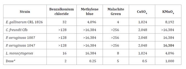 Therefore, all strains showed MIC values greater than the dose usually used in ranaculture, excepting E. gallinarum CRL 1826 when using malachite green. Therefore, E. gallinarum CRL 1826 is sensitive to antibiotics and resistant to antiseptics used in bullfrog farms.