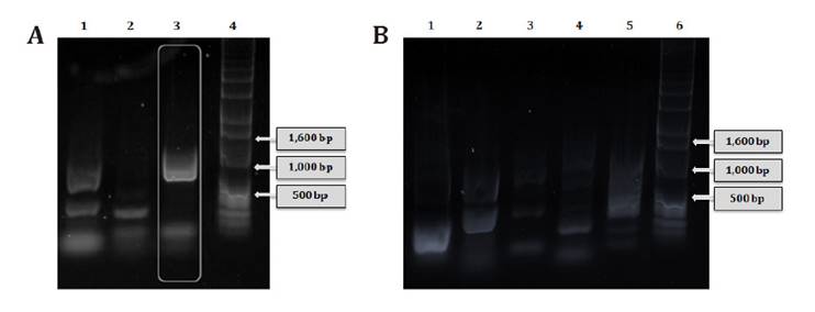 (A) Genes de resistencia a vancomicina 1: producto de amplificación del gen vanA; 2: vanB; 3: vanC; 4: marcador de peso molecular de ADN de 1 Kb. (B) Genes de factores de virulencia. 1: agg; 2: cylA; 3: gelE; 4: esp; 5: efa; 6: marcador de peso molecular de ADN de 1 Kb.