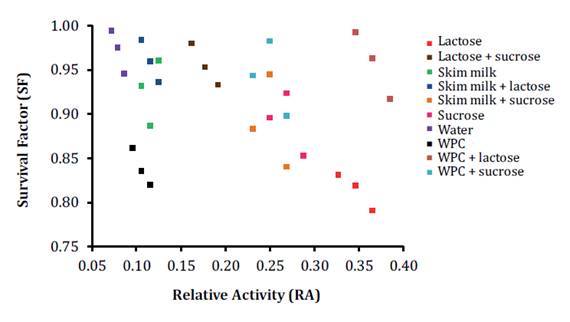 Figure 2. Viability (SF) and bacteriocin activity (RA) scatter plot of lyophilized E. gallinarum CRL 1826. WPC: whey protein concentrate.
