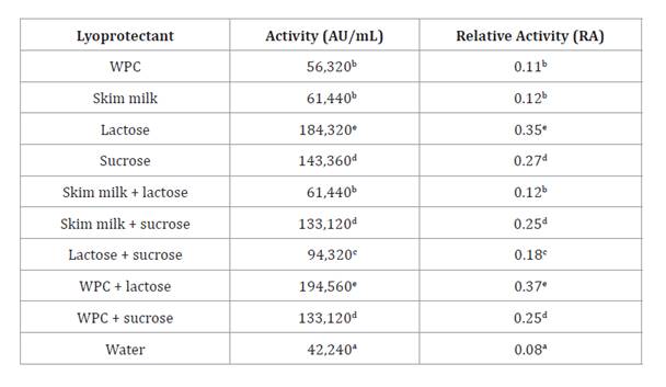 Optimal cell viability recuperation was detected in water, SM-L, WPC-L, L-S, WPC-S, and SM, with SF values from 0.93 to 0.97, without significant differences (p≤0.05, Fisher test). Bacteriocin production in lyophilized cultures was calculated as relative activity (RA) (table 3).