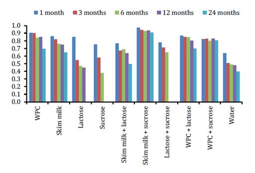 Despite lyoprotectants enhance survival during lyophilization, they may not provide protection during storage (9). Thus, the CRL 1826 strain viability decreased gradually and a total loss was observed at 25°C in L, S, and SM-L after one month of storage.