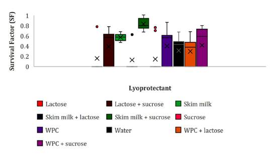 We determined the freeze-drying resistance of the LAB strain using nine lyoprotectants. The three average SF values ranged between 0.81 to 0.97 (figure 2).