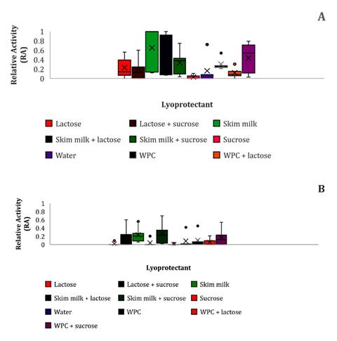 Thus, the nine lyoprotectant solutions increased RA values (0.11-0.37) when compared with those obtained in water (0.08) after freeze-drying (figure 2). However, the highest RA values were detected when the LAB strain was lyophilized in L (RA=0.35) and WPC-L (RA=0.37), without significant differences (p≤0.05, Fisher test). Considering RA and SF values, the optimal freeze-drying condition was WPC-L (figure 2). However, no correlation was found between both factors (Pearson correlation coefficient: 0.08).