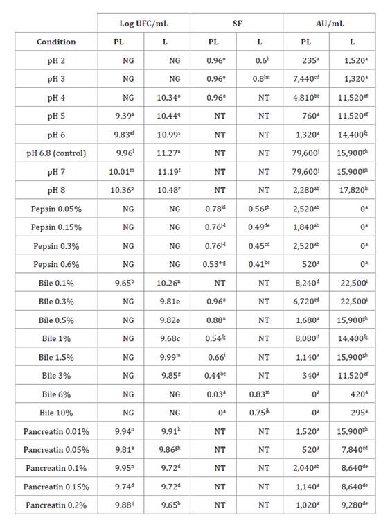 Lyophilized cultures (L) grew in a greater number of conditions. For example, LAPTg broth at pH 4, and 0.3-3% bile. Moreover, the highest bacteriocin activities (22,500 AU/mL) were detected with 0.1 and 0.3% bile (table 4). Also, L cultures resisted acid pH (2 and 3), 6 and 10% bile, and all pepsin concentrations. In these conditions, the highest bacteriocin activity (1,520 AU/mL) was determined at pH 2 for 18 min and was not detected with pepsin (table 4). Therefore, L cultures showed the greatest mean growth value (10.17 Log CFU/mL) and resistance (SF=0.83) significantly higher than for PL (8.50 Log CFU/mL and SF=0.73, respectively) (LSD Fisher, p>0.05).