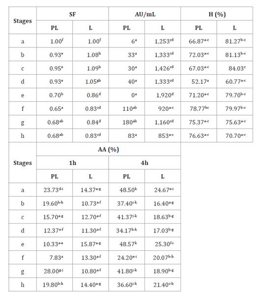 Overall, LAB strain viability decreased during the simulated gastrointestinal digestion process. The L cultures showed higher viability values (mean SF=0.92) than PL (mean SF=0.82). Both PL and L cultures showed no significant differences in viability between stages b to d (Phase 1: pH 7.4 to 2.0 + pepsin 0.6%, 90 min). Moreover, the lowest viability values were observed at stages f to h (Phase 3: pH 8 + 0.3% bile + 0.1% pancreatin; 30, 60, and 90 min), where no significant differences were determined (p>0.05) (table 5).
