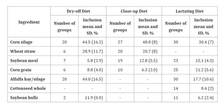 Tabla 2. Inclusión promedio (DE) de ingredientes de dietas de vacas secas, preparto y frescas o en lactancia en establecimientos lecheros de Argentina.