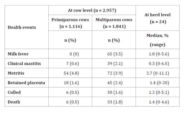 Table 3. Incidence of health events during the first 21 days in milk at cow- and herd-level in dairy farms in Argentina.