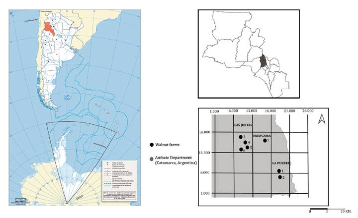 Figura 1. Área de estudio. Fincas de nogales en Ambato, Catamarca, Argentina.