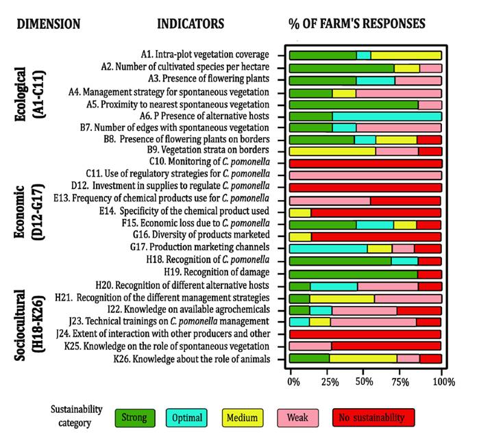 Figure 2. Percentage distribution of indicator sustainability based on farmer responses (%). All indicators are related to Cydia pomonella recognition and control.