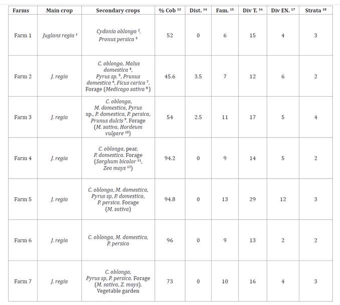 1. Walnut. 2. Quince. 3. Peach. 4. Apple tree. 5. Pear tree. 6. Plum tree. 7. Fig tree. 8. Alfalfa. 9. Almond tree. 10. Barley. 11. Sorghum. 12. Corn. 13. Average percentage of vegetation cover on the farm. 14 Average distance from the walnut tree to the nearest spontaneous vegetation. 15. Number of families. 16. Total number of species. 17. Number of species belonging to the families Fabaceae, Asteraceae and Apiaceae: attractive to natural enemies (EN). 18. Number of vegetation strata.
