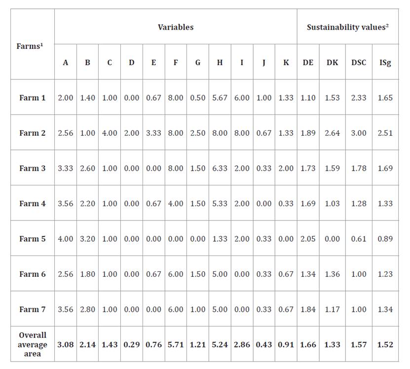 Table 3. Indicator values in seven walnut farms in Ambato, Argentina, and general sustainability conditions.