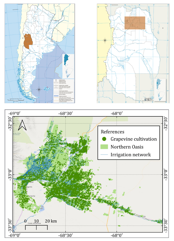 Our area of study, the Mendocinian Northern Oasis irrigated by the Mendoza and Tunuyán Inferior Rivers, is home to more than half of the province’s total population (figure 1). This region is characterised by an arid and semi-arid climate. The average annual minimum and maximum temperatures are 11°C and 23°C, respectively, with an annual rainfall of 267 mm (SMN, 2024). The soils are classified as typical Torrifluvents with a loamy texture (INTA, 1990).