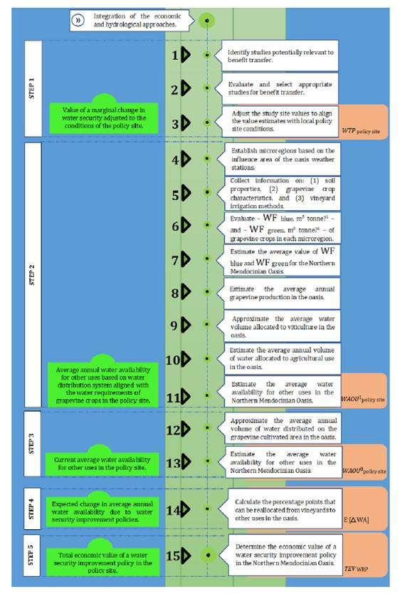 In this study, we adopted a multidisciplinary approach. The benefit transfer method (BTM), widely used in the field of economics, was applied to extrapolate values obtained from a previous study site to a policy site. These values were used to predict welfare changes in the Mendocinian Northern Oasis under water security policies that would reallocate agricultural water to other uses. Additionally, a hydrological approach -specifically, the water footprint (WF) methodology proposed by Hoekstra et al. (2011)- was employed to estimate changes in water availability for these alternative uses. This integrated approach, used to estimate the total economic value (TEV) of a water security improvement policy, is summarised below and illustrated in figure 2.