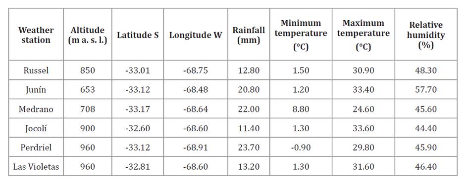 Initially, specific data on rainfall, minimum and maximum temperatures, and relative humidity were collected from six weather stations in the Mendocinian Northern Oasis (2010-2020). Then, we used these data to divide the oasis into six climatic microregions based on each station’s influence area. As a result, each microregion retains the name of its corresponding weather station.