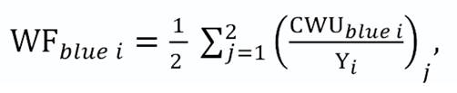 Where WFblue i represents the average blue WF in the i-th microregion, taking into account both surface and pressurised irrigation systems; CWUblue i is the blue CWU in the i-th microregion; Yi is the yield per hectare in the i-th microregion; and j is the irrigation method, ranging from 1 to 2 (specifying, j = 1 surface and j =2 pressurised irrigation systems). The distinction in the irrigation systems was considered using various crop coefficients (Kc) to account for the differences in water requirements between surface (j = 1) and pressurised (j = 2) irrigation methods.