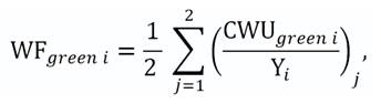 Where WFgreen i represents the average green WF in the i-th microregion, taking into account both surface and pressurised irrigation systems; CWUgreen i is the green CWU in the i-th microregion; Yi is the yield per hectare in the i-th microregion; and j is the irrigation method, ranging from 1 to 2 (specifying, j = 1surface and j =2 pressurised irrigation systems).