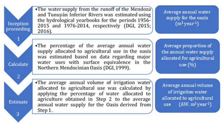 Figure 4. Process for estimating the average annual volume of irrigation water allocated for agricultural use in the Mendocinian Northern Oasis.