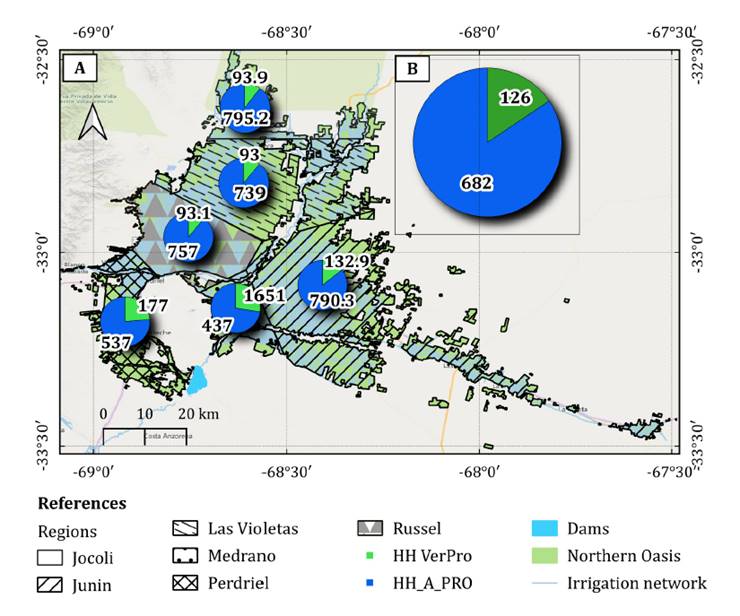 Figure 5. Blue and green WF (m3 tonne-1) (A) for each of the six microregions and (B) for the Mendocinian Northern Oasis.