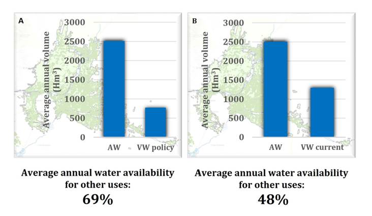 We estimated that, under a water distribution system aligned with the grapevine crops’ water requirements, 69% of water could, on average, be available annually for other uses (Equation 6; figure 6A). This estimate is based on the average annual water volumes allocated to viticulture (figure 3) and agriculture (figure 4).