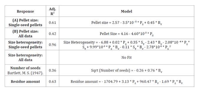 The model describing the number of seeds per pellet was significant (adjusted R² = 0.36; figure 3). Although predictive precision was moderate, the model adequately represented overall behavior (Pedrozo et al. 2024). Increasing binder volume led to the formation of conglomerates.