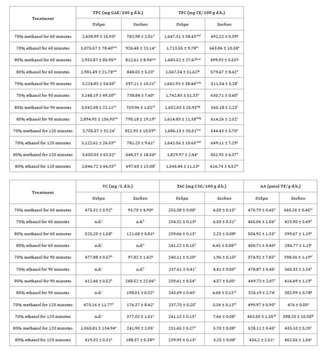 (64.86% ethanol, 90 minutes) yielded TPC = 3,587 and 948 mg GAE/100 g, TFC