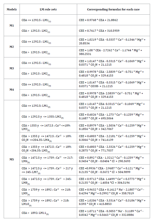 M1, M2, M3, and M4 generated identical rules: if CEA is less than or equal to 1292.5 μS cm-1, LM1 equation is to be applied, whereas if CEA exceeds this value, LM2 equation should be used (table 1). Equations depend on variables considered in each model. Although M5 includes more variables and has a good correlation coefficient, its complexity makes it less practical.