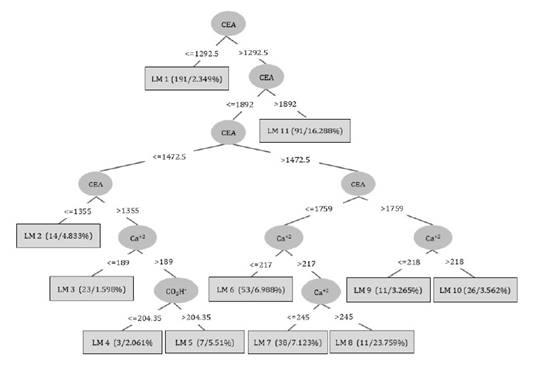 Figura 3. Árbol de regresión del Modelo 5 (M5), que muestra las reglas de los 11 Modelos lineales (LM) generados, con soporte y confianza.