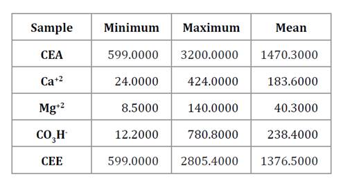 Considering CEE, correlations are similar to those found with CEA, but stronger for CO3H⁻ (almost perfect correlation) and moderately high for Mg 2+. The lack of correlation between CEA or CEE and pH is corroborated.