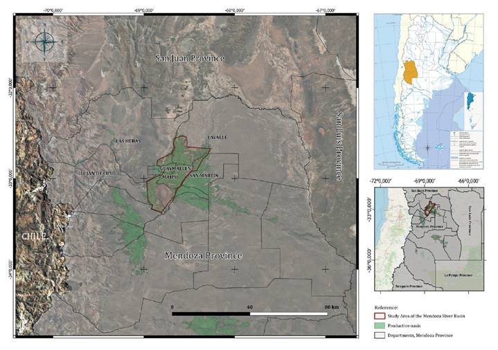 Figura 1. Mapa del área de estudio en la Cuenca del Río Mendoza, Provincia de Mendoza, Argentina.