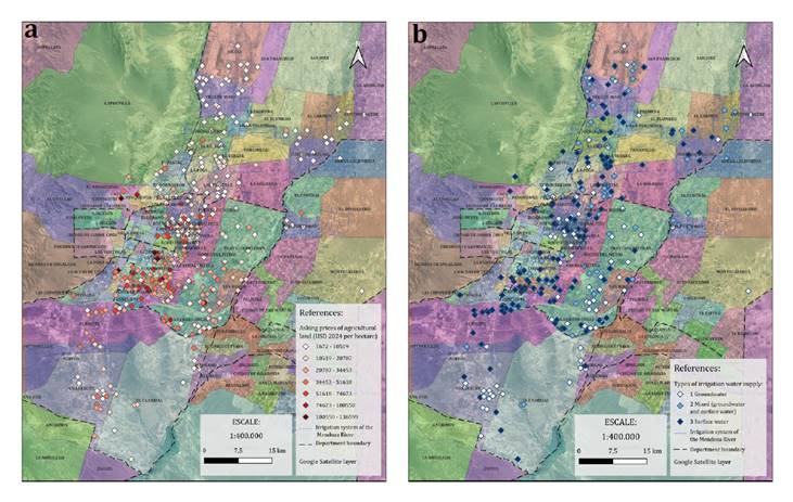 Vineyards predominate in Maipú and Luján de Cuyo -often complemented by enotourism and high-value agribusinesses- while Lavalle and Las Heras are characterised by more diversified cropping systems, including horticulture and forages. Spatial variability across the study area is shown in figure 2, which maps (a) asking farmland prices per hectare (constant 2024 USD, by range) and (b) irrigation water supply type.