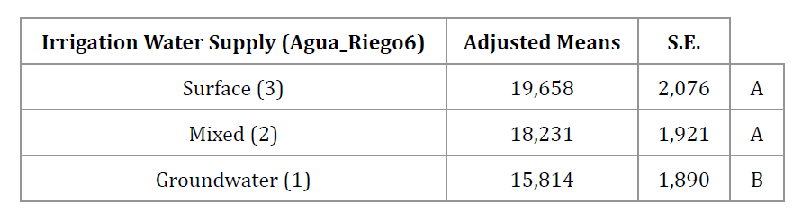 Tabla 2. Comparación de medias ajustadas de precios según tipo de abastecimiento de agua de riego (resultados de ANCOVA, LSD de Fisher, α = 0,05).