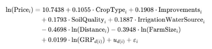 Keywords: hedonic pricing, farmland value, irrigation water, land characteristics, geostatistics, arid regions, river basins