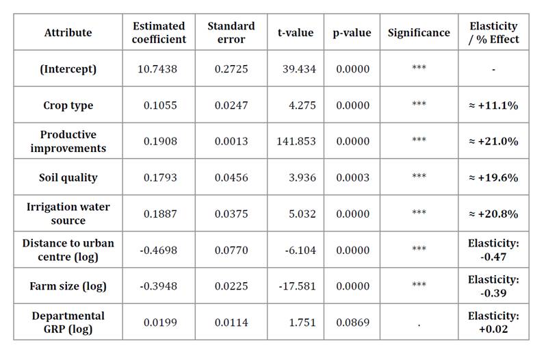 Continuous variables exhibit the expected negative elasticities: for distance to the urban centre (β = -0.445), a 10% increase reduces prices by ≈ 4.5%, and doubling distance lowers values by ≈ 26-27%. For farm size (β = -0.299), a 10% increase reduces prices by ≈ 3.0%, and doubling area lowers values by ≈ 18-19%. Departmental GRP has a small but positive and statistically significant effect (β = 0.037).