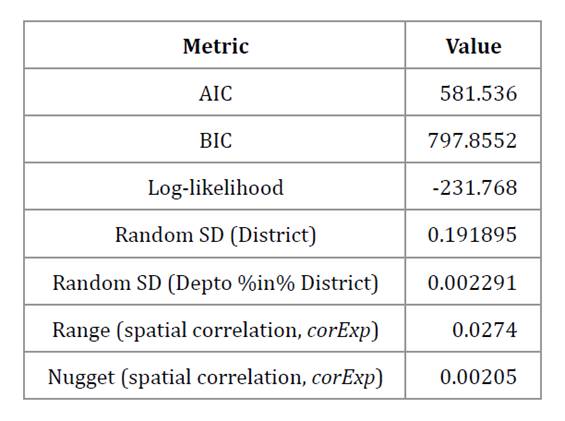 Goodness-of-fit metrics confirm the adequacy of this specification (table 4). The model achieves a log-likelihood of -231.8, with AIC = 581.5 and BIC = 797.9. The random-effects structure captures territorial heterogeneity: the district-level random intercept shows meaningful variability (SD ≈ 0.192), while the department-within-district component is negligible. The exponential spatial correlation (corExp) presents an estimated range of 0.0274 and a small nugget effect (0.00205), indicating limited residual spatial dependence once fixed and random effects are accounted for.