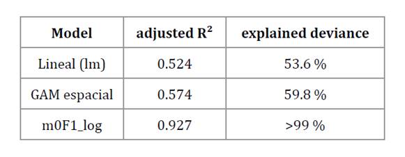 First, table 5 reports the explanatory performance of the models in terms of adjusted R² and explained deviance. The results highlight the improvement from the baseline OLS (m_lin) to the spatial GAM and finally to the mixed spatial log- log model (m0F1_log), which attains the highest explanatory power (>99% deviance explained) while preserving interpretability in terms of elasticities.