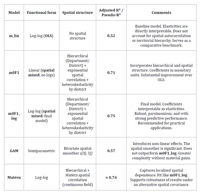 Model comparisons drew on adjusted R², explained deviance, and residual diagnostics. The spatial mixed model (m0F1_log) was ultimately retained for its combination of interpretability (elasticities) and superior overall fit.