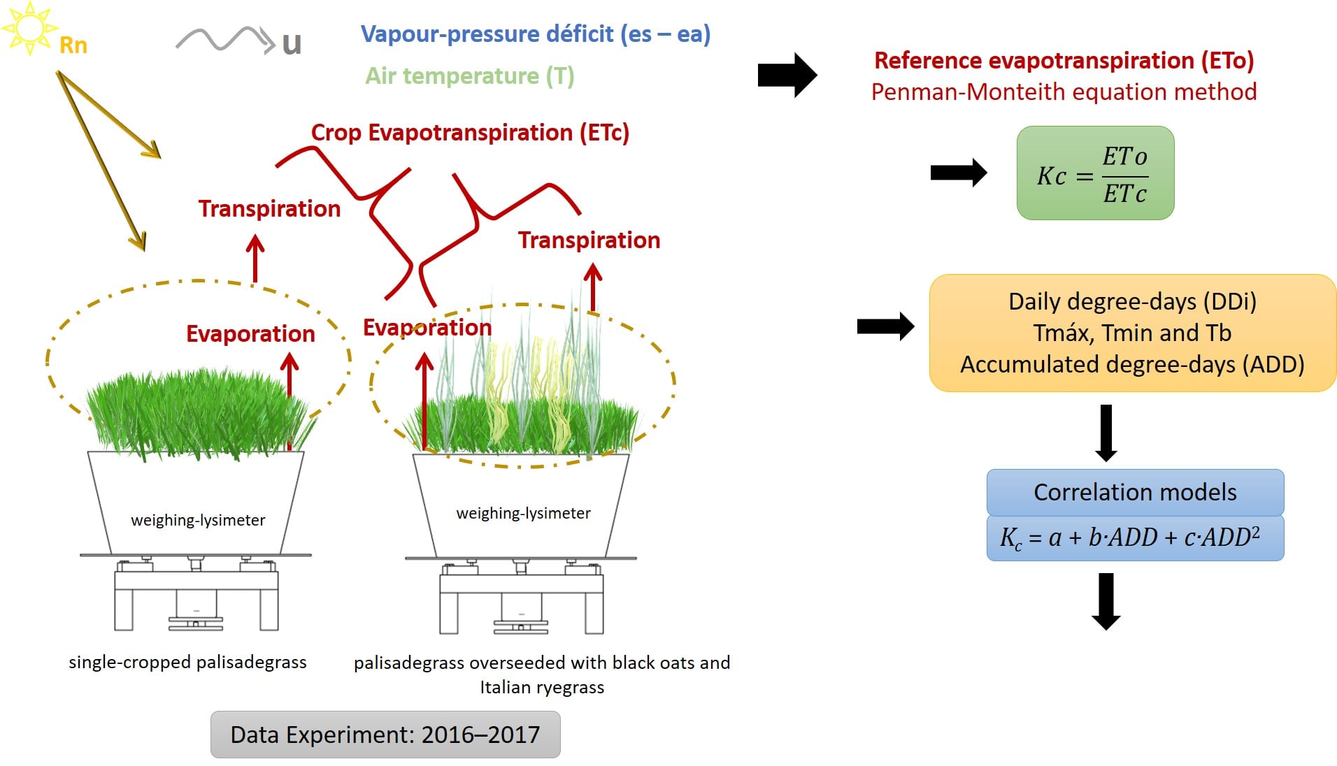 Considering profitability in pasture-based systems, investigating parameters affecting crop coefficients for irrigation management becomes important. In this experiment, we determined the crop coefficient of ‘Marandu’ palisadegrass based on accumulated degree-days and estimated plant water consumption under single (‘Marandu’ alisadegrass) and mixed (‘Marandu’ palisadegrass + black oats + Italian ryegrass) cropping regimes. The research was conducted at the Luiz de Queiroz College of Agriculture in Piracicaba, São Paulo, Brazil, between 2016 and 2017. Evapotranspiration was assessed using weighing lysimeters while crop evapotranspiration was calculated using mean weight variation. Reference evapotranspiration and degree-days were estimated. Data were obtained from an automated weather station. Equations and regression models relating crop coefficient with accumulated degree-days were generated for two seasons (spring/summer and autumn/winter) and evaluated for two year-cycles, from 2015 to 2018. The results showed better prediction accuracy for the single cropping system in spring/summer 2017–18.
