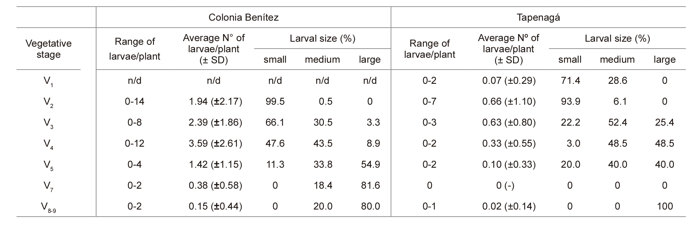 El cogollero es la plaga más importante del maíz en Argentina, siendo escasa y desactualizada la información sobre su estatus como plaga en los últimos 20 años. Se llevaron a cabo estudios de campo a fin de establecer las tasas de ataque y los niveles de daño de la plaga en relación con la fenología del cultivo en el noreste de Argentina. El estudio se realizó en dos localidades: Colonia Benítez, zona agrícola, y Tapenagá, zona ganadera. En cada localidad se sembraron dos parcelas de una hectárea, una con maíz transgénico expresando la proteína Bt Cry 1F y la otra con su correspondiente isogénico no transformado. Se registraron para dos fechas de siembra: cantidad de larvas, composición relativa de edades, tasa de ataque y nivel de daño al cultivo. En el momento del ensayo de campo, el maíz Bt no fue afectado por la plaga; sin embargo, el isogénico (sin gen Bt) fue atacado con una media superior al 18% de plantas dañadas. Comparando con datos obtenidos hace 30 años en esta región, se obtuvieron mayores valores de densidad de larvas/planta. Los niveles de daño fueron mayores después de V4. La fecha de siembra incide en los niveles de infestación: siembras tempranas evitan las altas densidades del cogollero que se desarrollan durante el verano, pero para la región estudiada esto solo fue relevante en la zona agrícola.