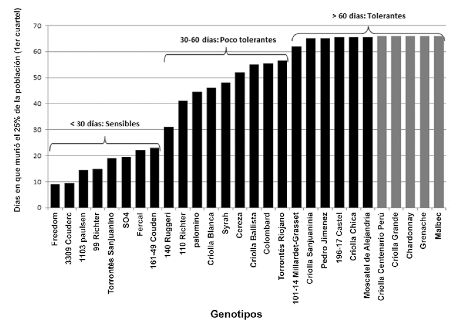 El objetivo fue evaluar la supervivencia al riego con soluciones de NaCl en 28 genotipos del género Vitis para identificar su grado de tolerancia salina. Se estudiaron 11 híbridos de Vitis americanos y 17 variedades de Vitis vinifera. Plantas de 1 y 2 años se regaron durante 66 días con una solución 100 mM de NaCl. Para clasificar las variedades de acuerdo con su grado de tolerancia a la salinidad, se calculó el día en que el 25% de la población había muerto (1er cuartil de la muestra). Se consideraron como genotipos sensibles aquellos en que al menos 25% había muerto antes del día 30 (3309 Couderc, 161-49 Couderc, Fercal, Freedom, 1103 Paulsen, 99 Richter, SO4, Torrontés Sanjuanino), como poco tolerantes cuando al menos 25% murió entre los días 30 y 60 (Cereza, Colombard, Criollas Blanca y Ballista, Palomino, 110 Richter, 140 Ruggeri, Syrah, Torrontés Riojano) y como tolerantes cuando el 75% o menos sobrevivió más de 60 días (101-14 Millardet-Grasset, 196-17 Castel, Criollas Chica y Sanjuanina, Moscatel de Alejandría, Pedro Giménez). Aun en los genotipos más tolerantes cuando las plantas crecieron bajo salinidad, la integridad de membranas celulares se redujo un 17% y el contenido de clorofila total disminuyó un 52%.