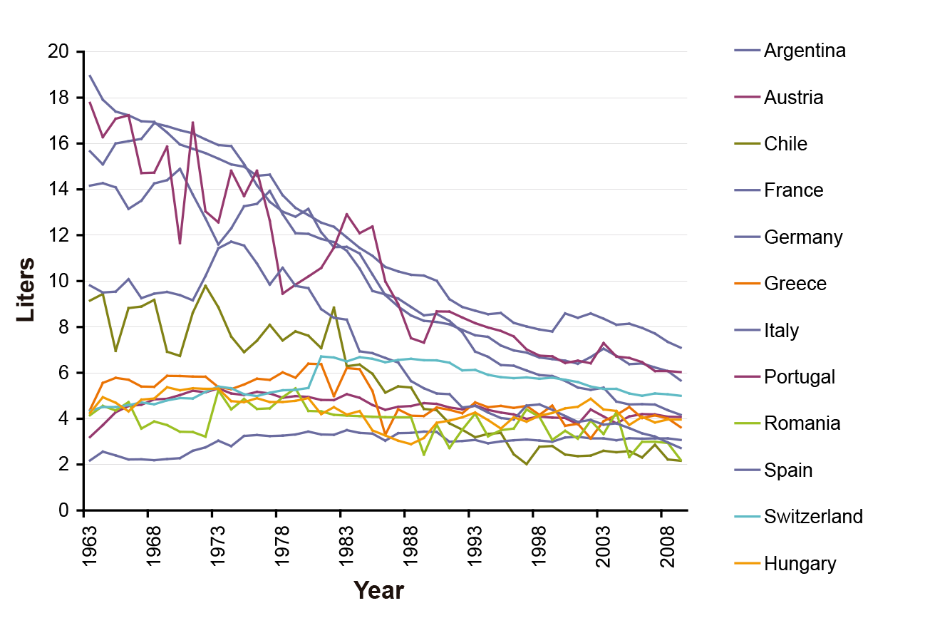 Este paper compara las dinámicas del consumo internacional de vino de los últimos 50 años en 26 países, con el objetivo de averiguar si existe una tendencia global hacia un estilo de consumo común, al margen de las diferencias impositivas y arancelarias, políticas económicas y sistemas de distribución de cada país. Los resultados del modelo confirman las hipótesis de convergencia de tipo σ y de tipo β: se observa una disminución en la diferencia d-el consumo per capita de vino entre países y posteriormente un aumento hacia un valor central, en términos de litros. Los países "tradicionales", con niveles de consumo históricamente altos, han experimentado una disminución del mismo, mientras que países emergentes con menor tradición de consumo de vinos han registrado un crecimiento. Estos resultados no solo apoyan la teoría del consumo internacional del vino desde un punto de vista cuantitativo, ya verificada en mercados europeos, sino que extiende su alcance hacia otros mercados. Se observa también una convergencia cualitativa, fenómeno que podría reflejar un cambio mundial en los gustos de los consumidores hacia un modelo con tendencias a la uniformidad.