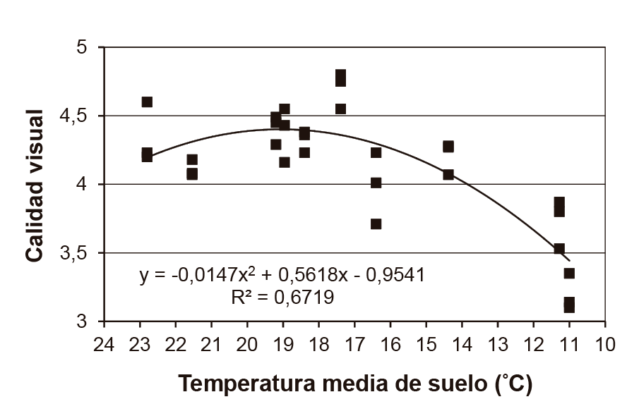 Los objetivos fueron determinar temperaturas medias de suelo (TMS) y mínimas de aire (TMA) adecuadas para realizar resiembras otoñales; evaluar la tasa de crecimiento (TCC) de Cynodon dactylon (Bermuda) que minimice la competencia con la especie resembrada y el comportamiento de distintas especies mesotérmicas en el centro-sur de la provincia de Córdoba. Se resembró durante 2010 y 2011, en un diseño de parcelas divididas con cinco fechas de siembra (FS) quincenalmente desde principios de marzo, con tres genotipos: Lolium multiflorum cv Axcella, L. perenne y L. perenne cv Excel I. Las temperaturas se midieron entre principios de marzo y hasta que la bermuda entró en dormición, calculando TMA y TMS. En las subparcelas resembradas se registraron calidad visual y cobertura total; además, en la bermuda se calculó la TCC. Las resiembras que lograron valores más altos de calidad visual, cobertura y bajas TCC de la Bermuda, se dieron con TMS entre 18 - 21°C y TMA entre 11,5 - 15,5°C. De acuerdo con los valores medios normales de la región centro-sur de Córdoba, las temperaturas óptimas se observan entre la segunda década de marzo y primera de abril. Los tres genotipos tuvieron comportamientos similares independientemente de la FS utilizada.