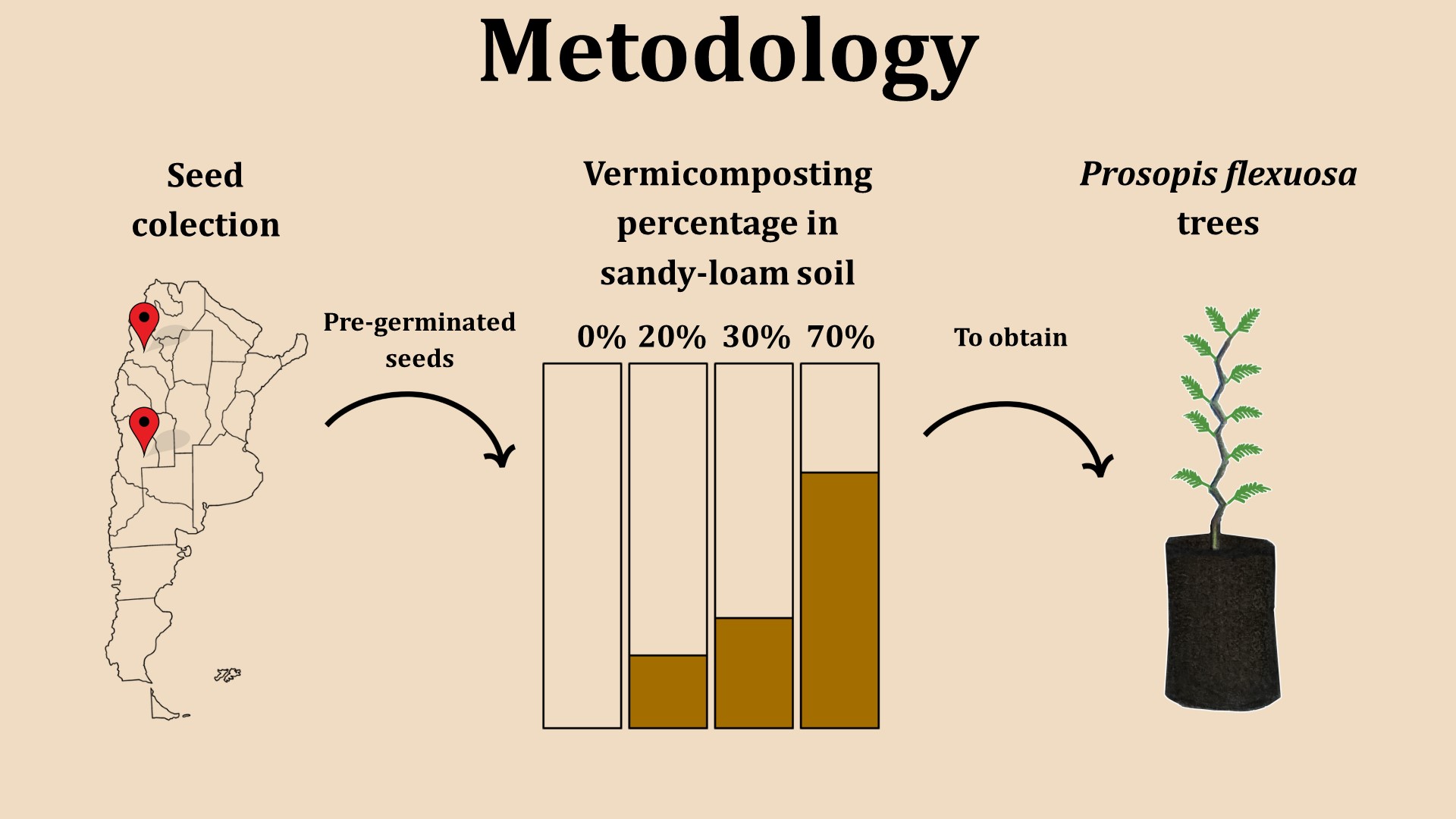 Substrate composition and seed origin influence the morphological characteristics of future trees. This study aimed to quantify growth of sweet algarrobo plants, Neltuma flexuosa, obtained from seeds collected from two sites in Argentina and grown on substrates with varying vermicompost percentages. A completely randomized factorial design was used with four levels of vermicompost percentage (0; 20; 30; 70) and two levels of seed origin (Monte Comán, Mendoza and; Bolsón de Fiambalá, Catamarca) (n= 360). Height growth rate (from root neck to apex) (Delta height), root neck diameter growth rate (Delta diameter), and Slenderness index were measured for each plant. Results showed that northern sweet algarrobo specimens growing on vermicompost-enriched substrates had a significantly higher Delta height (p<0.05). Additionally, northern specimens growing on 30-70% vermicompost-enriched substrates and southern specimens growing on 30% vermicompost-enriched substrates had a significantly higher Delta diameter compared to those growing on vermicompost-free substrates. Moreover, northern specimens growing on vermicompost-enriched substrates had a significantly higher slenderness index than southern specimens. Based on these findings, we recommend using seeds from the northern region and substrates with a minimum addition of 20% vermicompost for sweet algarrobo cultivation.