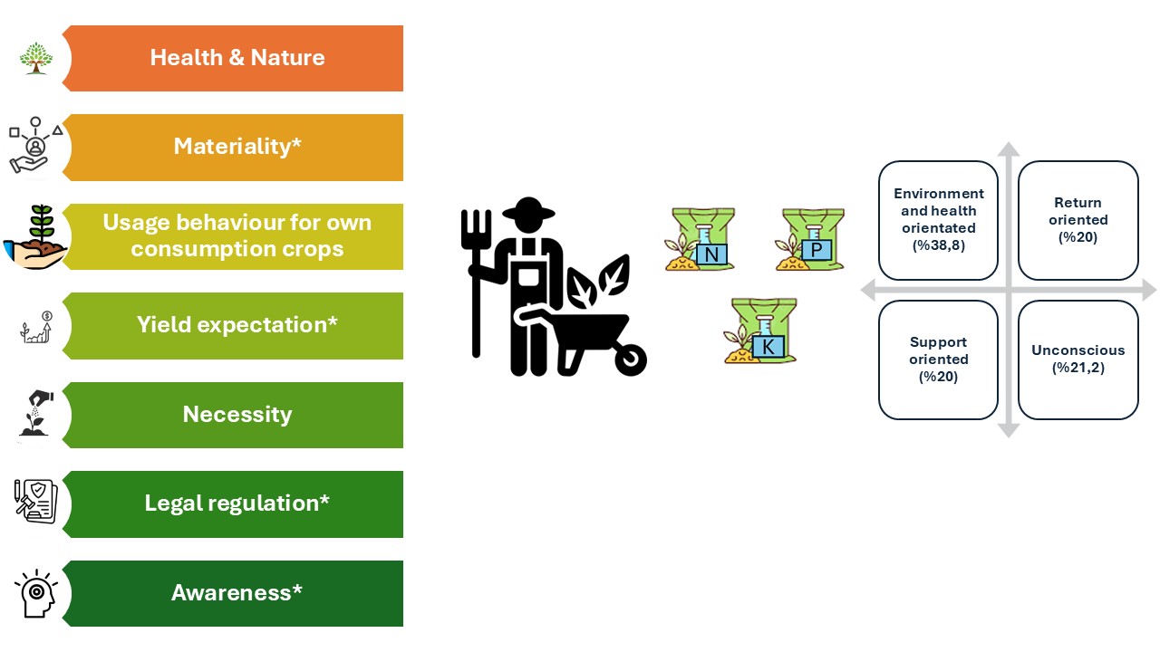 Fertilizer use has been important for decades. Recent records show significant increases in their usage. Excessive and unconscious applications threaten human and environmental health and cause economic losses. This study aims to identify farmers’ fertilizer use behaviour in Izmir province. In 2016, survey data were collected using a structured questionnaire concerning farmers’ views and attitudes regarding fertilizer use. Seven factors were identified, explaining 80.34% of total variability, determining farmers’ behaviour in the study area by cluster analysis. Farmers in the region were classified into four groups. The largest group, “environment and health-oriented”, comprised 38.8% of the farmers. We concluded that farmers consider environmental sensitivity regarding fertilizer applications; however, environmental awareness should be further developed.
