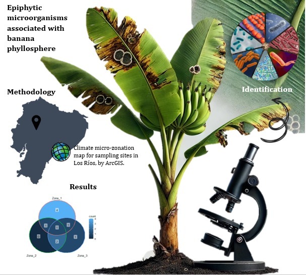 Black Sigatoka (Pseudocercospora fijiensis) is the most important leaf spot disease of bananas worldwide, particularly affecting Cavendish banana, the most exported variety. Additionally, this pathogen has developed resistance to some effective fungicides, making its management increasingly difficult. Epiphytic microorganisms with potential antagonism to P. fijiensis were identified in conventional banana farms in the province of Los Ríos. Sampling areas were determined through zoning processes and selecting the cantons of Mocache, Valencia, Baba and Pueblo Viejo. Leaf tissue samples were collected from three farms per zone. Microorganisms were isolated and morphologically and molecularly characterised in nine farms in the cantons of Valencia (63 bacteria), Baba (39 bacteria), Pueblo Viejo (8 bacteria) and 8 genera of fungi including 15 species. The isolated bacteria presented macroscopic and microscopic characteristics with different shapes, elevations, edges, consistencies and pigmentations. Taxonomically, they belonged to the genera Bacillus and Cocos, 81% Gram-negative and 19% Gram-positive. The analysis conducted for sampling-site selection allowed the identification of different microbial behaviours.