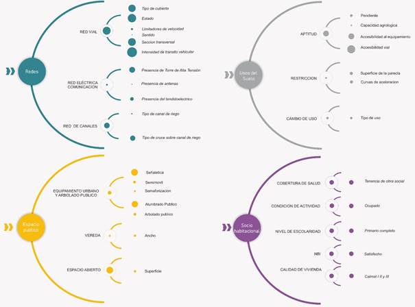 En primera instancia se definen los criterios para la evaluación holística de la vulnerabilidad físico-social de poblaciones bajo riesgo sísmico: redes de infraestructura, espacio público, usos del suelo y nivel socio-habitacional (ver Figura 1). Según investigaciones previas, los mismos representan los principales ejes implicados en la toma de decisiones sobre la reducción de la vulnerabilidad sísmica urbana (Bussy y Dall' Armellina, 2010; Instituto Nacional de Prevención Sísmica, 2017).