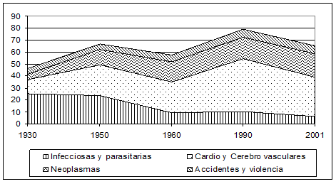 Si bien hacia 1950 se observa la persistencia de las enfermedades infecto-contagiosas (la diarrea y enteritis en los niños y la tuberculosis entre los jóvenes eran las causas de mayor incidencia en las muertes), en esta década comenzaron a adquirir protagonismo las enfermedades cardio y cerebrovasculares como principal causa de muerte, lugar que no habrán de ceder hasta el presente. Podemos afirmar, de hecho, que un patrón moderno de comportamiento de la mortalidad surgiría hacia la década de 1960, en el cual las enfermedades infecto-contagiosas se reducirían considerablemente (60%) en relación al período anterior, constituyéndose las enfermedades crónicas y los neoplasmas en las responsables estelares de las defunciones.