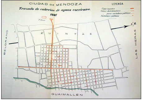 Figura 1: Mapa de cañerías de agua corriente a fines del siglo XIX (1887) intendencia de Lagomaggiore. Fuente: Citado de Raffa, 2007:22.